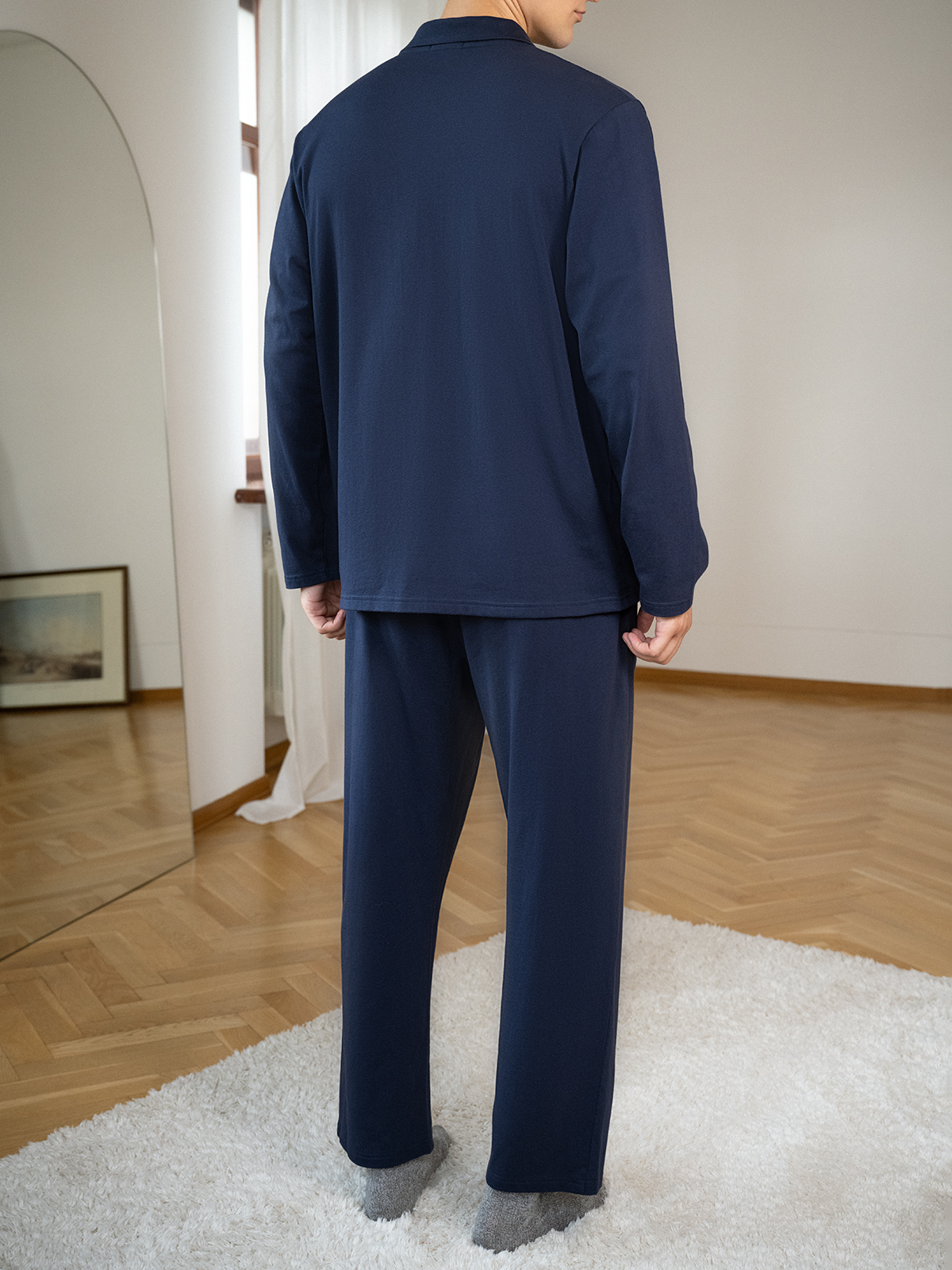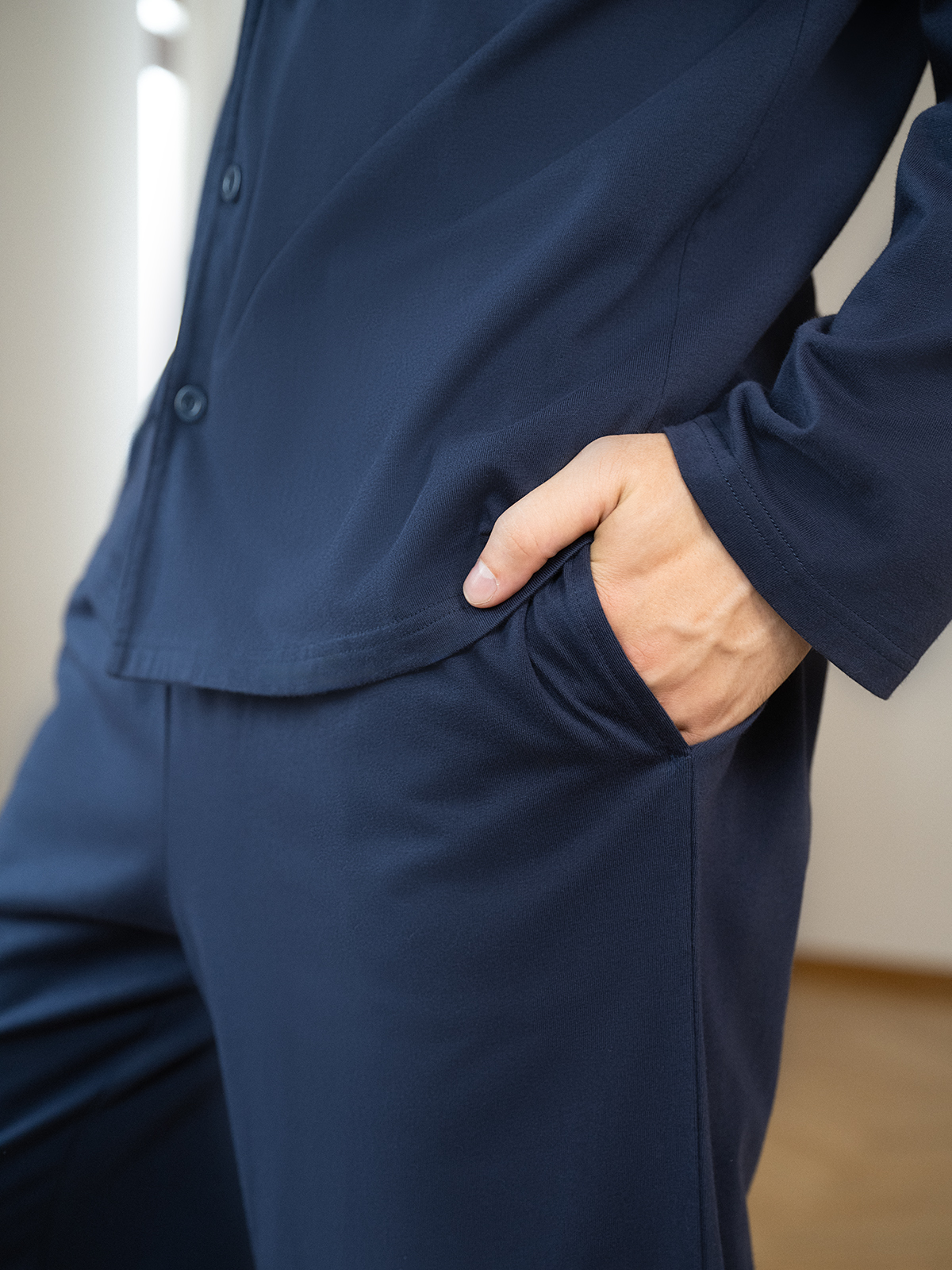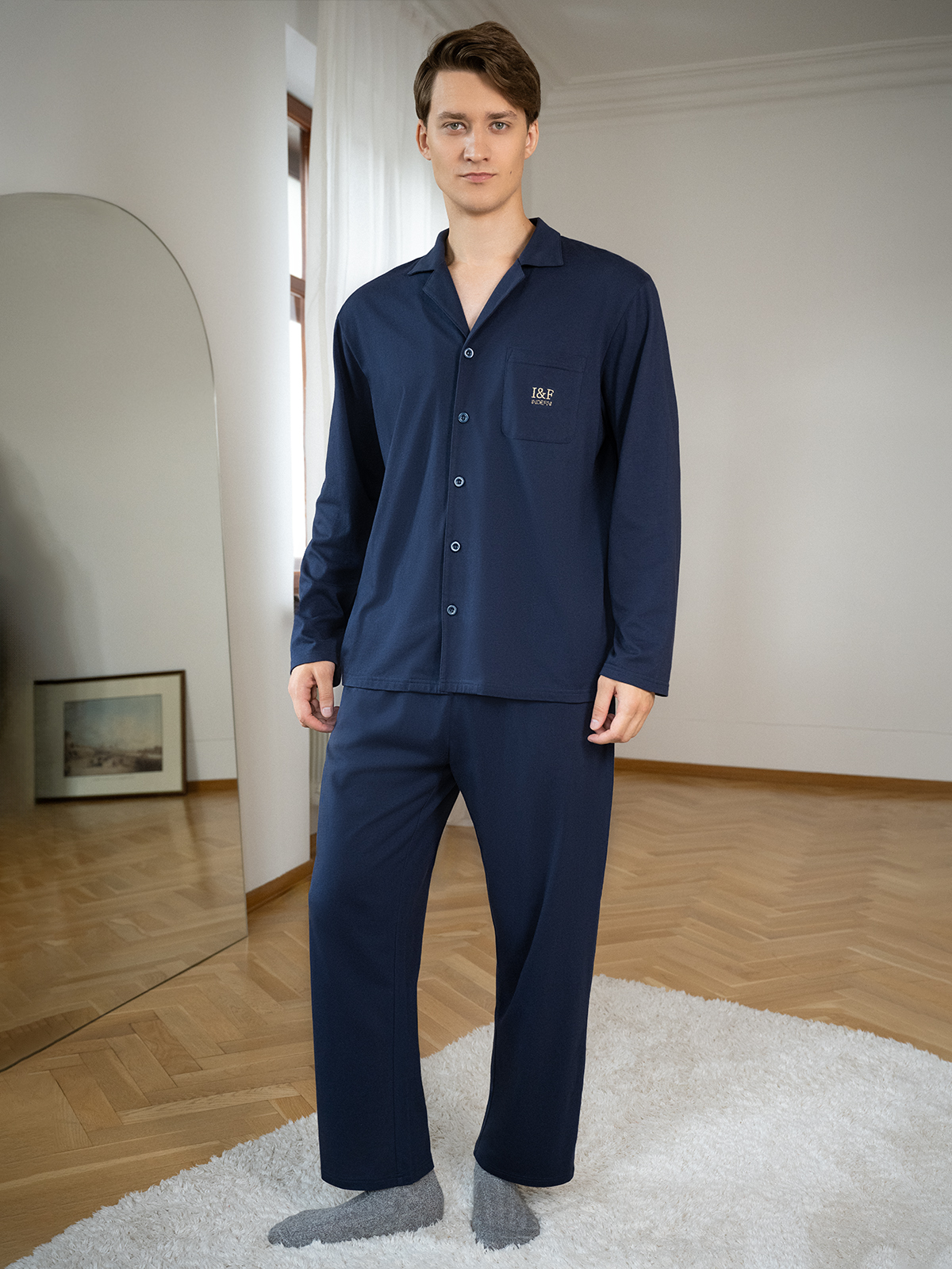 Мужская пижама Indefini выполнена из 100% хлопка в классическом темно-синем цвете. Комплект состоит из рубашки на пуговицах с длинным рукавом и нагрудным карманом, а также прямых брюк на мягкой эластичной резинке.Натуральный хлопок обеспечивает отличную воздухопроницаемость и комфорт в течение всей ночи. Свободный крой не сковывает движений, а лаконичный дизайн делает пижаму универсальным выбором для домашнего отдыха и сна.