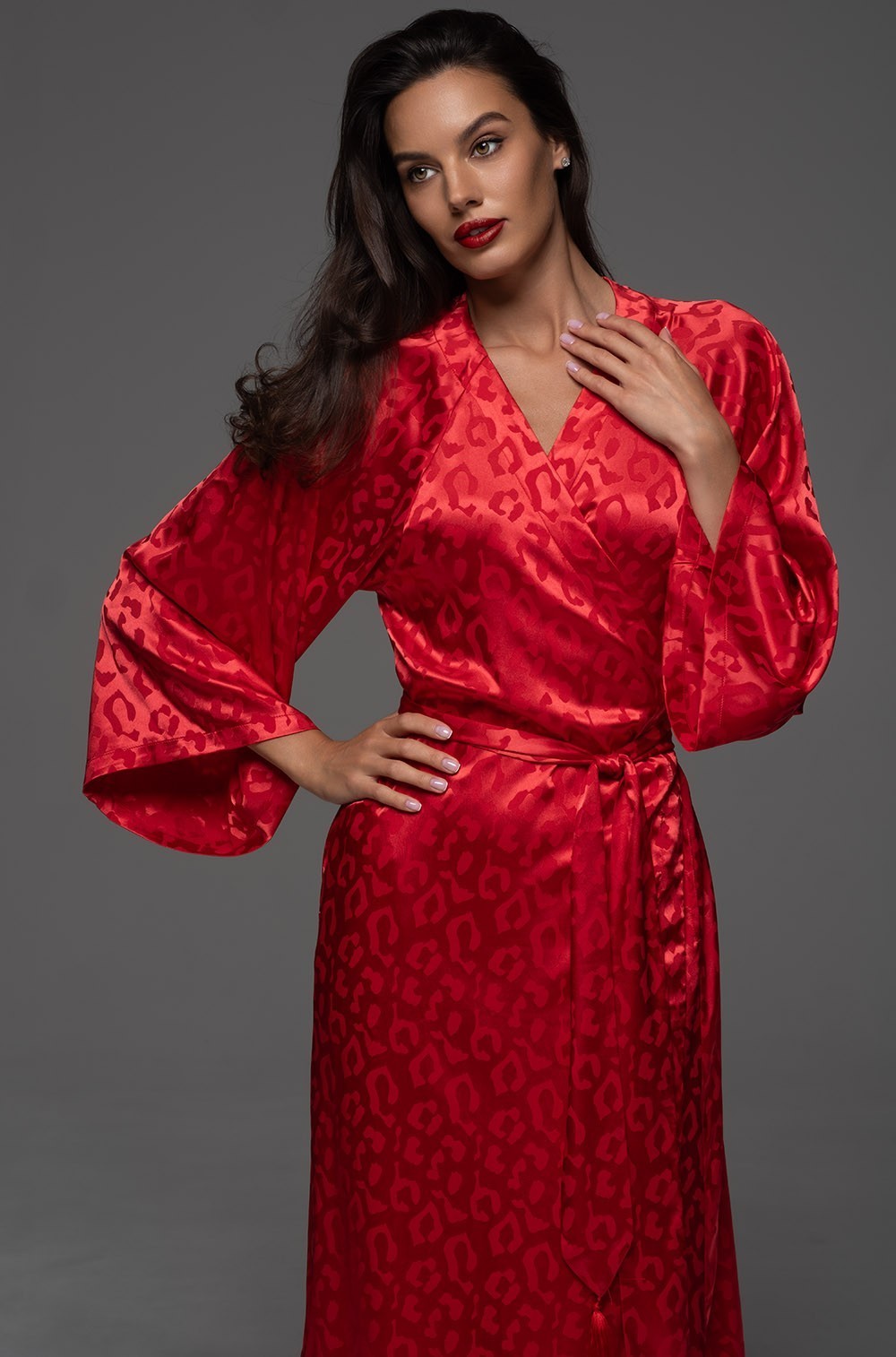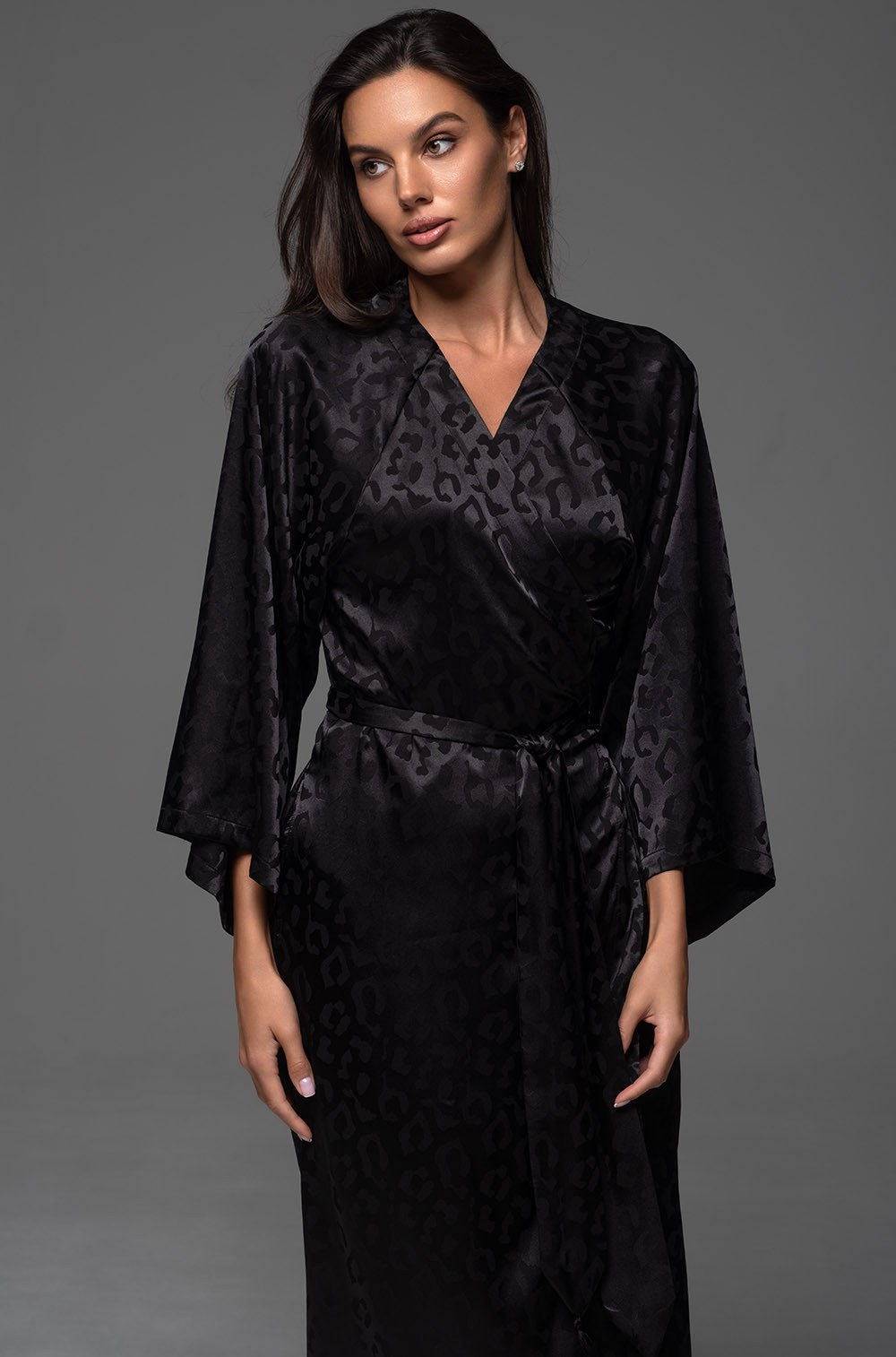 Длинный запашной пеньюар Mia-Amore с широкими длинными рукавами. Изделие выполнено из искусственного шелка на жаккардовой основе. По бокам пеньюара расположены карманы. Полы изделия фиксируются за счет широкого пояса с кисточками.