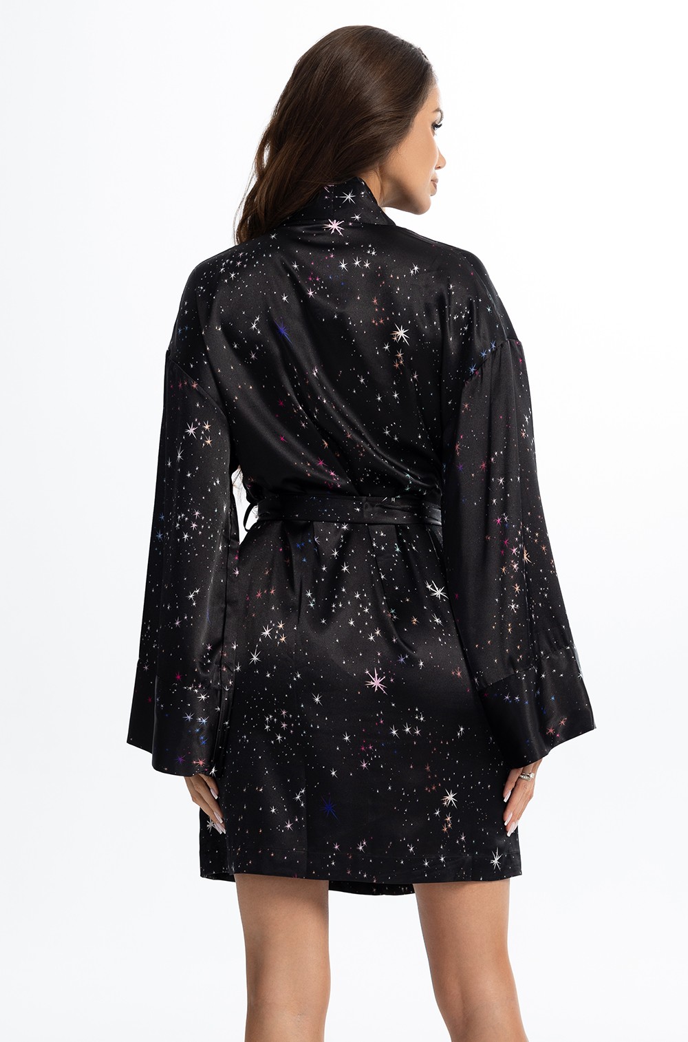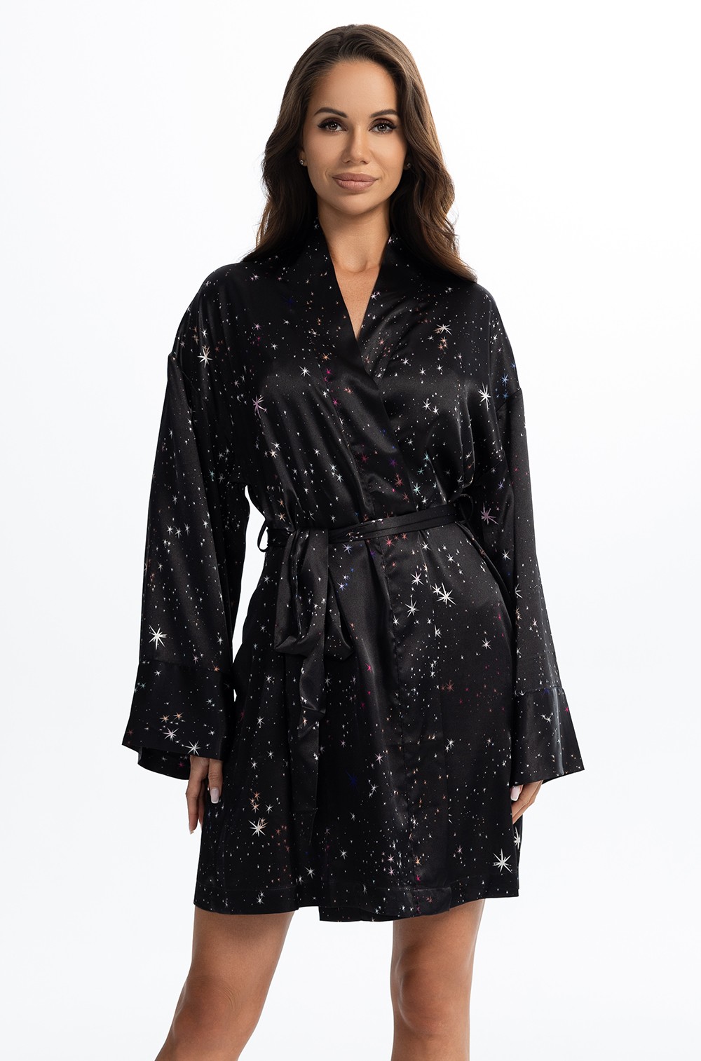 Короткий запашной халат Mia-Amore с длинными рукавами выполнен из принтованного искусственного шёлка. Халат комплектуется широким поясом, в боковых швах карманы.