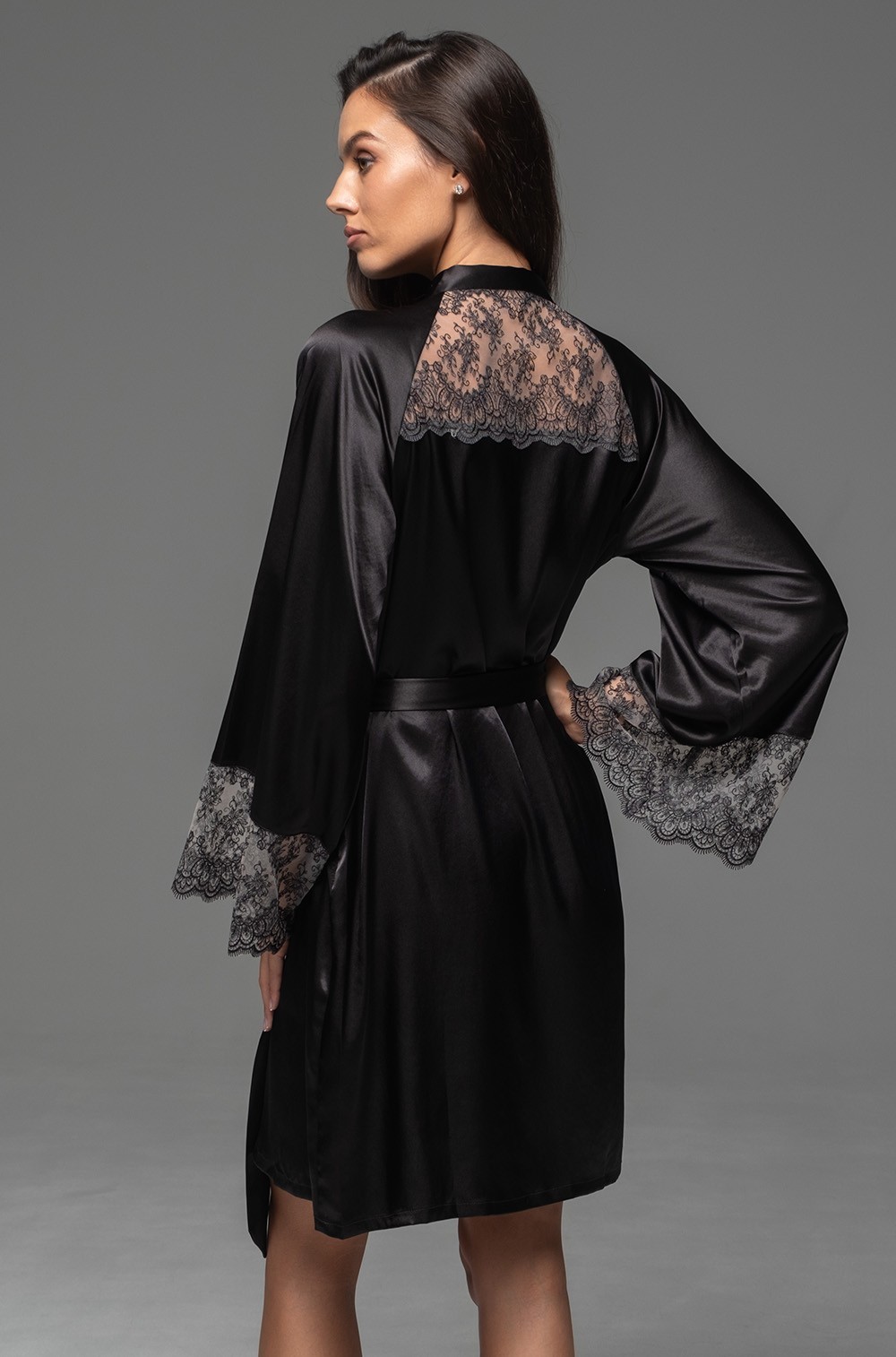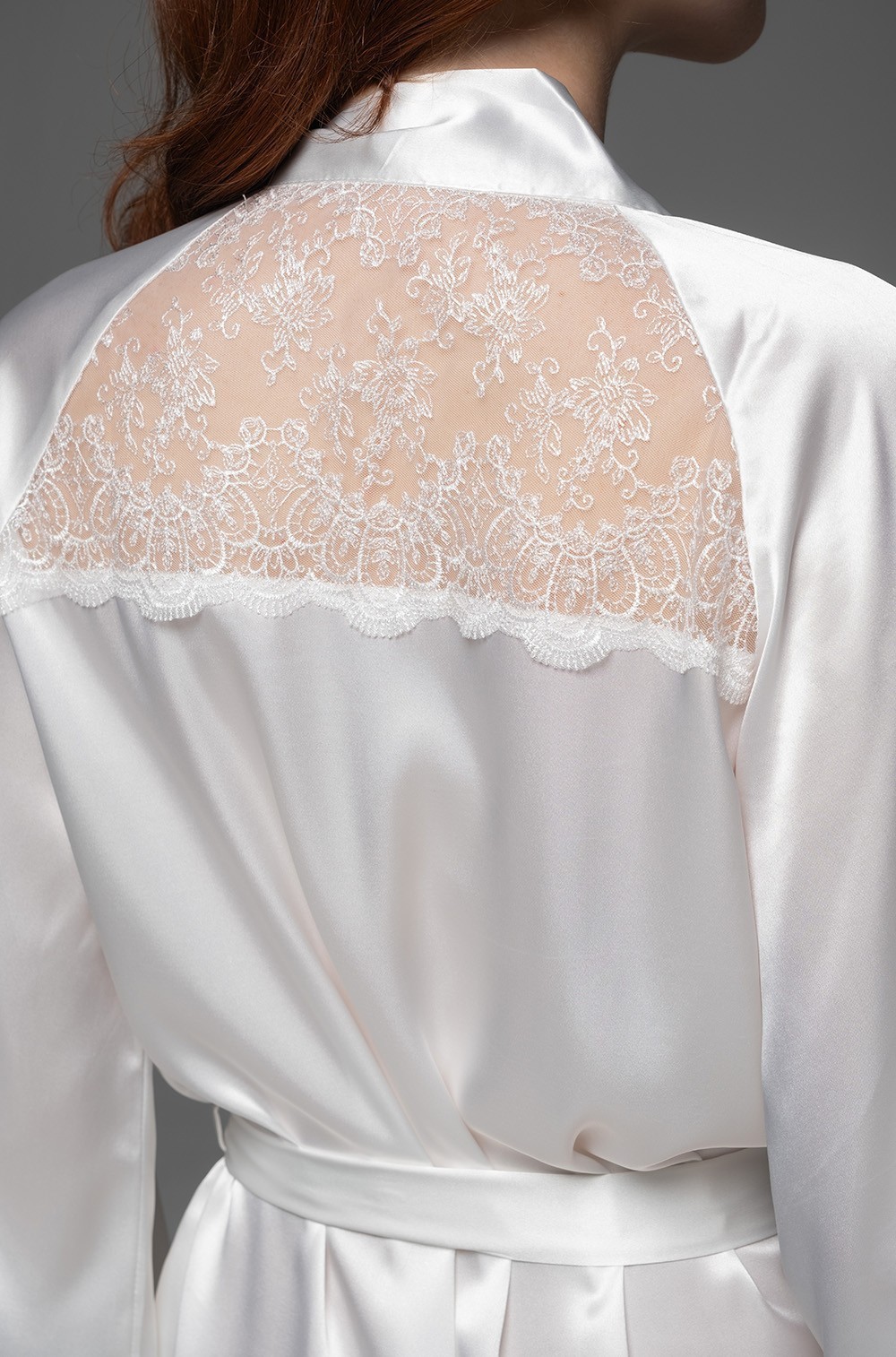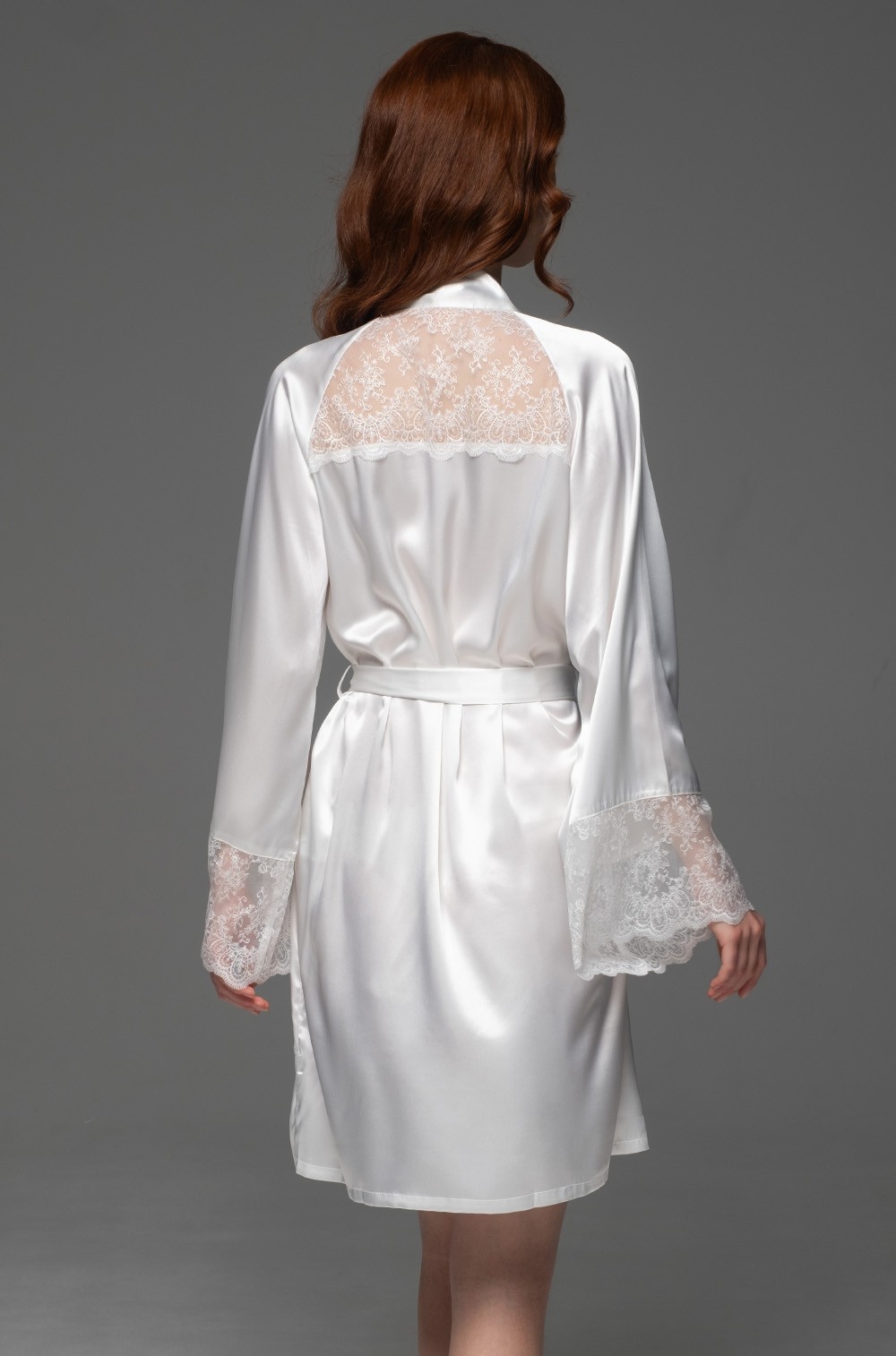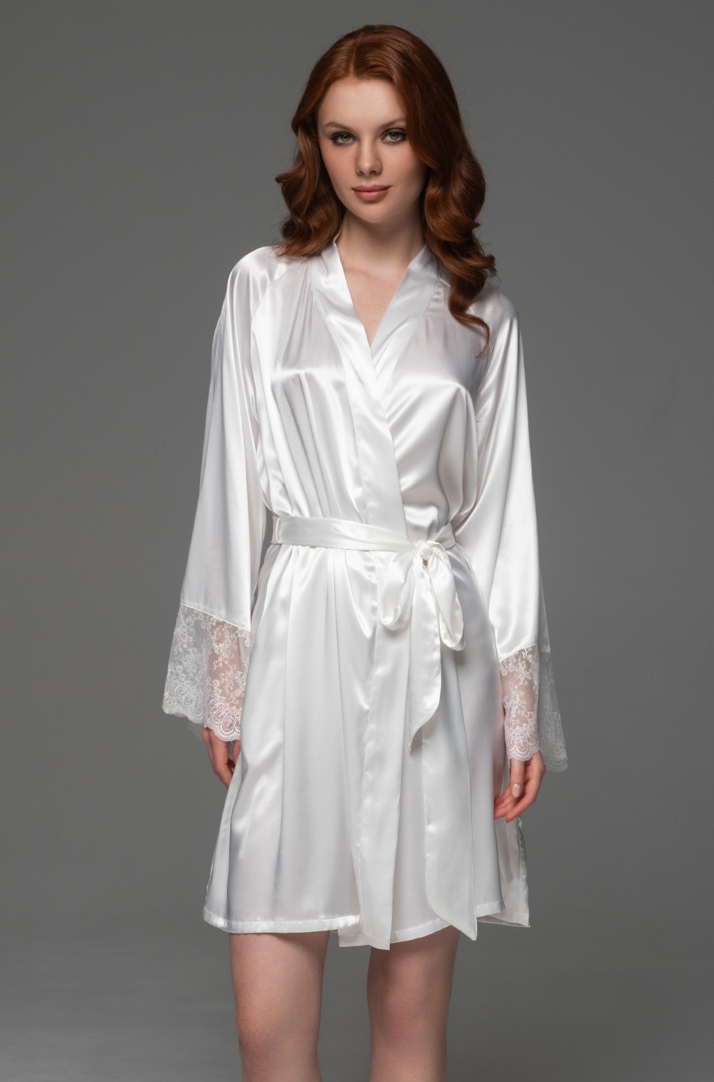 Халат Mia-Amore 4703 AdelaidaКороткий запашной халат Mia-Amore с длинными рукавами реглан выполнен из однотонного смесового шёлка. По низу рукава украшены широким вышивным кружевом. В боковых швах есть карманы. Халат запахивается с помощью широкого съемного пояса.