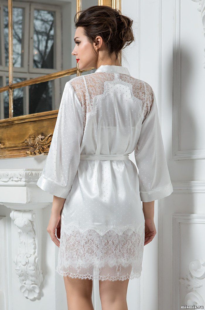 Короткий халат – кимоно Mia-Amore из искусственного шелка с жаккардовой основой. Вставки из ажурного кружева украшают верх и низ халата. По низу рукавов расположены небольшие разрезы. По бокам халата карманы.
