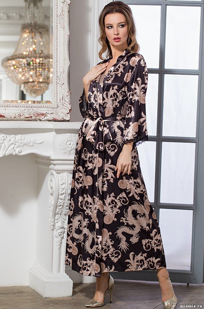 Длинный халат Mia-Amore с длинными рукавами выполнен из принтованного искусственного шелка. Рукава халата декорированы тонким кружевом.