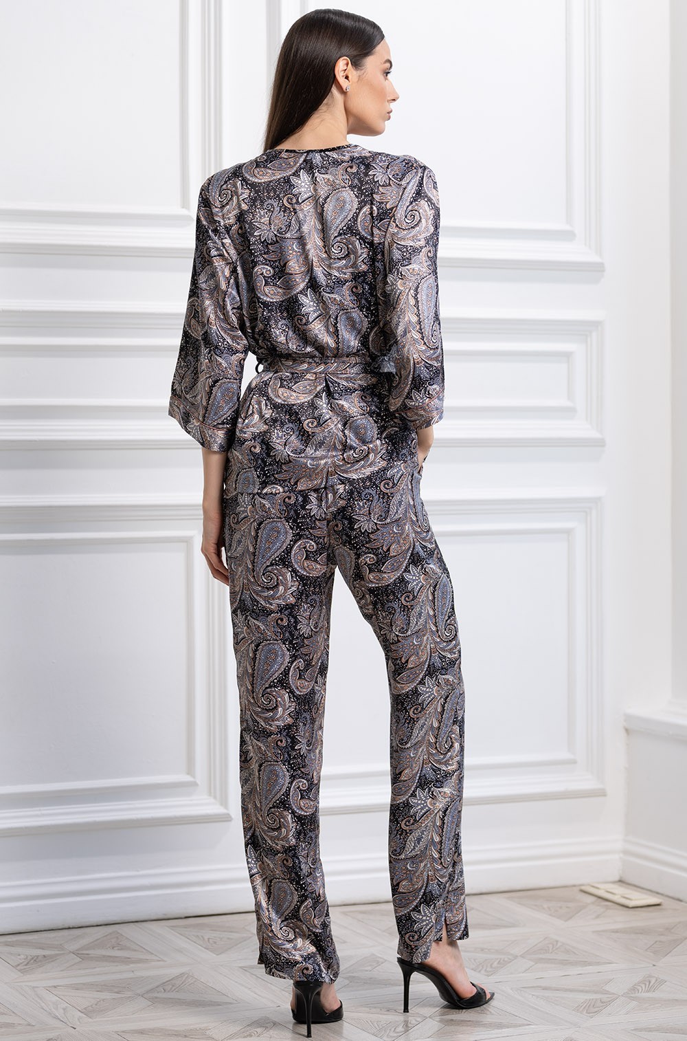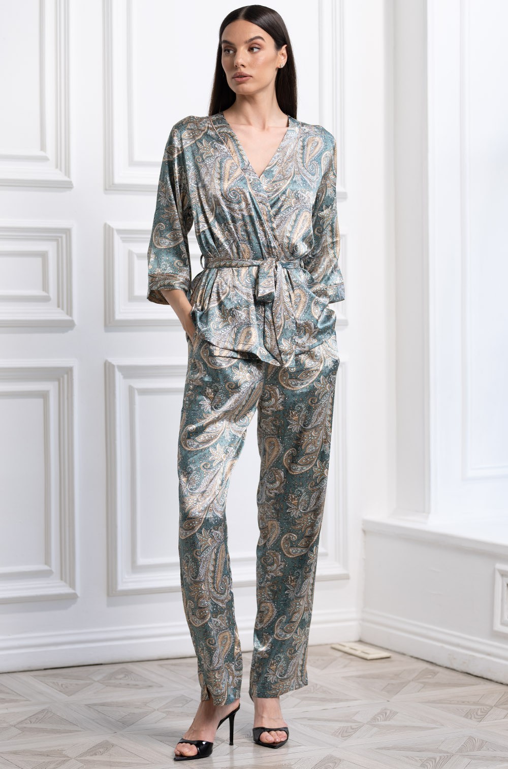 Пижама Mia-Amore 3075 DonatellaКомплект Mia-Amore состоит из жакета, топа и брюк. Изделия комплекта выполнены из принтованного смесового шелка. Отделка в виде контрастного канта по краям борта и манжетам жакета. Верх топа украшен кружевной вставкой. По бокам брюк обработаны карманы.