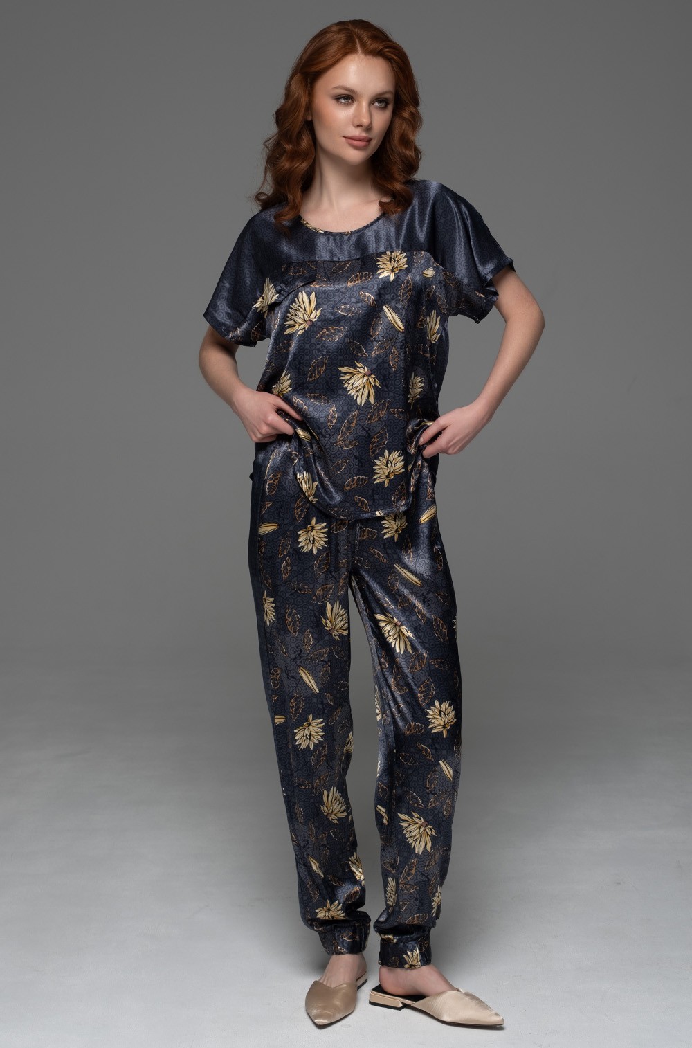 Пижама Mia-Amore 4694 MarygoldКомплект топ с брюками Mia-Amore выполнен из принтованного смесового шёлка. Топ со спущенными плечами, на полочке декоративный клапан с пуговкой. По низу штанины брюки собраны на манжет.