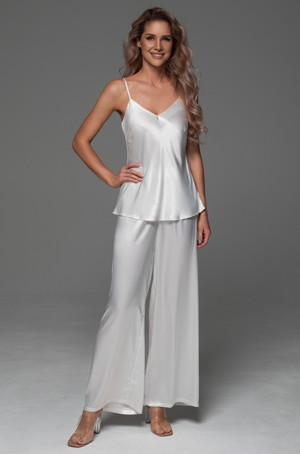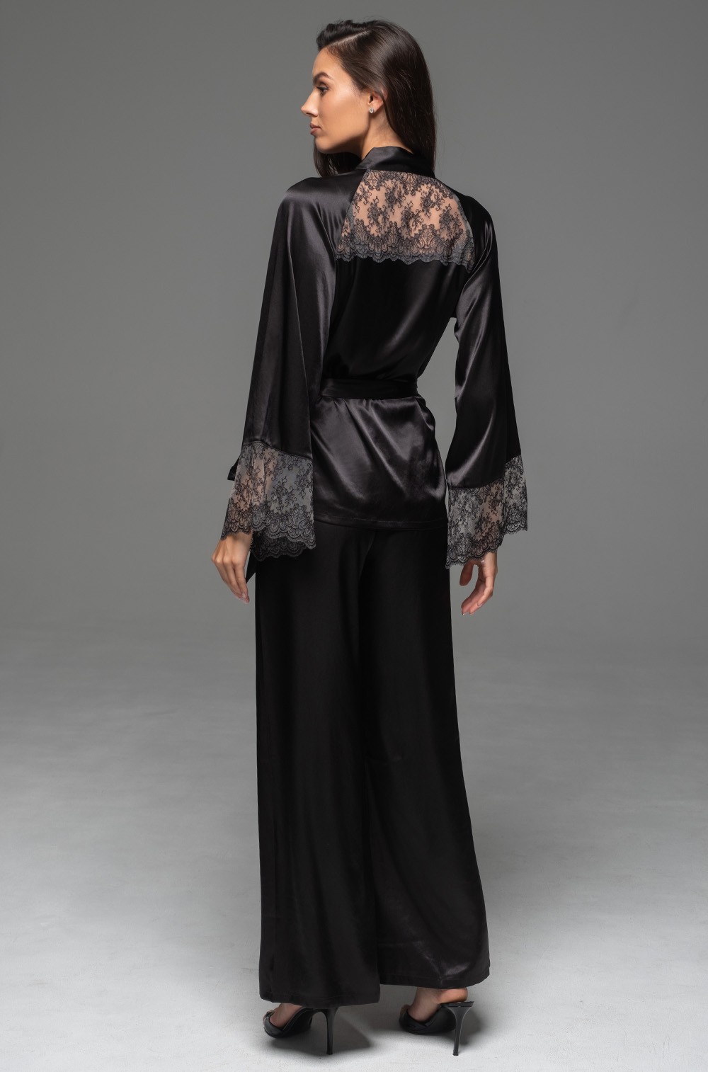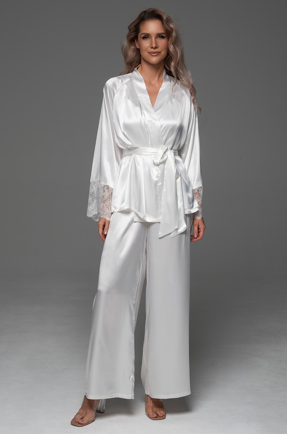Пижама Mia-Amore 4706 AdelaidaКомплект-тройка Mia-Amore выполнен из однотонного смесового шёлка, состоит из запашного короткого жакета, топа на тонких бретелях и брюк. Бретели топа на спинке украшены вставками из кружева, широкие брюки с эластичным поясом, рукава халата декорированы по низу кружевом. Жакет запахивается с помощью широкого съёмного пояса.
