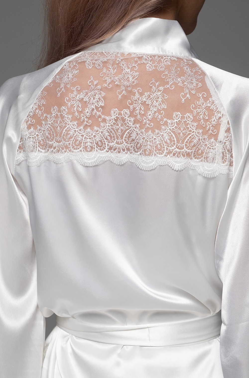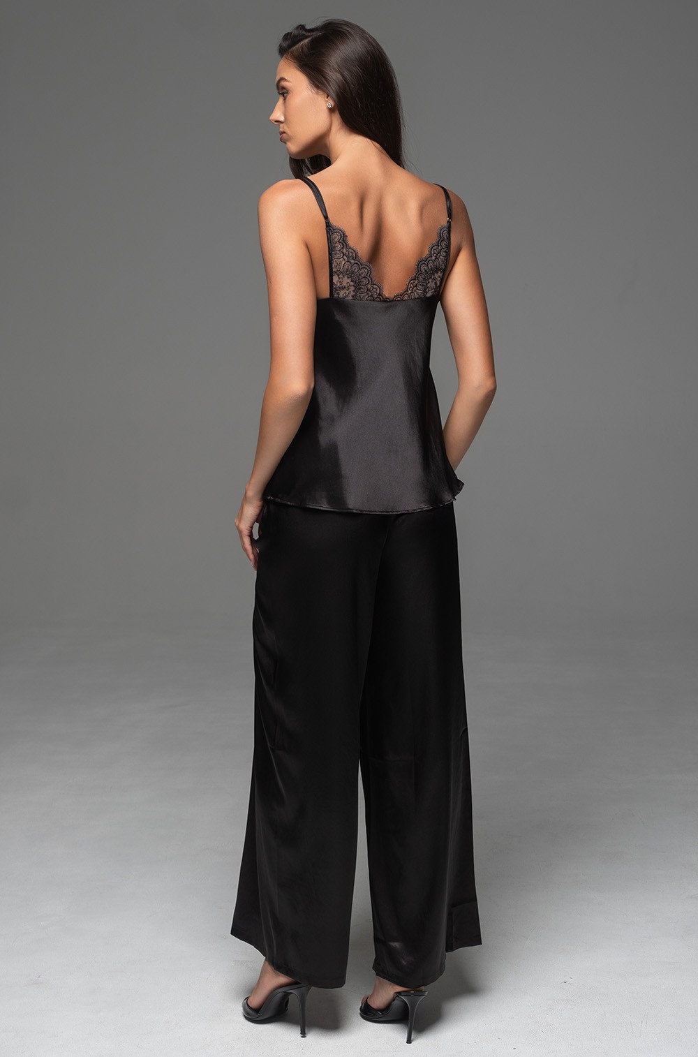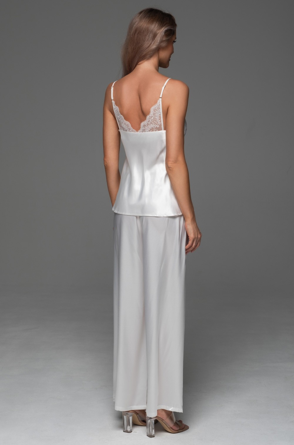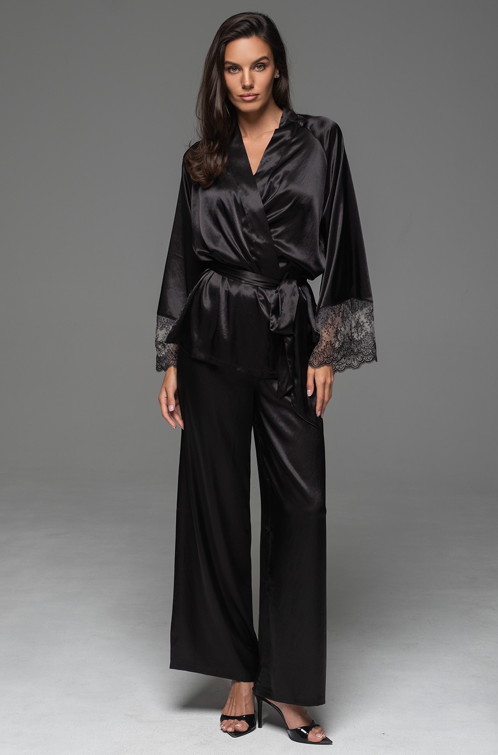 Пижама Mia-Amore 4706 AdelaidaКомплект-тройка Mia-Amore выполнен из однотонного смесового шёлка, состоит из запашного короткого жакета, топа на тонких бретелях и брюк. Бретели топа на спинке украшены вставками из кружева, широкие брюки с эластичным поясом, рукава халата декорированы по низу кружевом. Жакет запахивается с помощью широкого съёмного пояса.