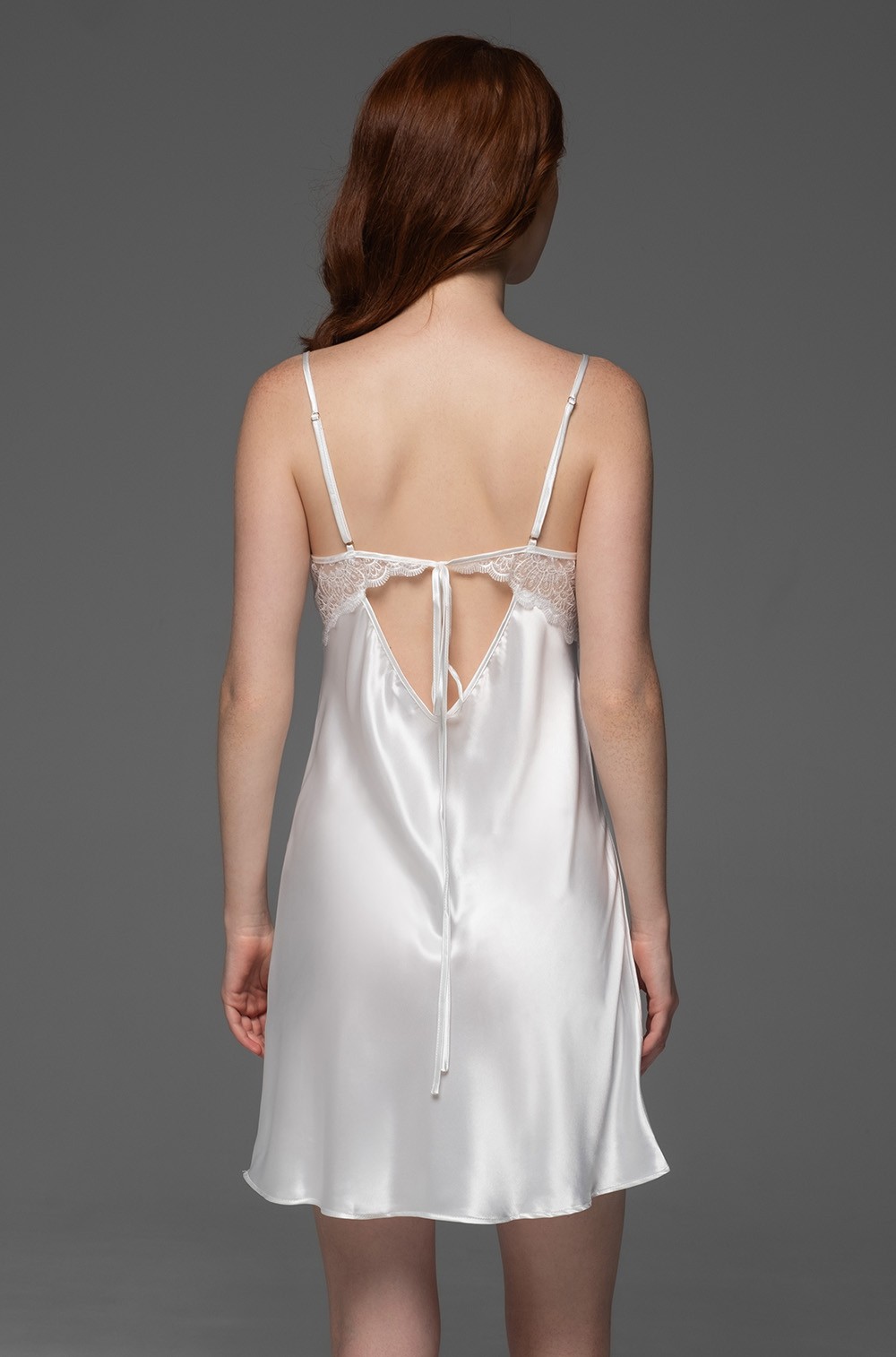 Короткая сорочка Mia-Amore на тонких регулируемых бретелях выполнена из однотонного смесового шёлка. Лиф сорочки декорирован вышивным мягким кружевом, на спинке эффектный вырез с кружевом и завязкой.Состав 70% натуральный шелк, 25% полиэстер, 5% эластан