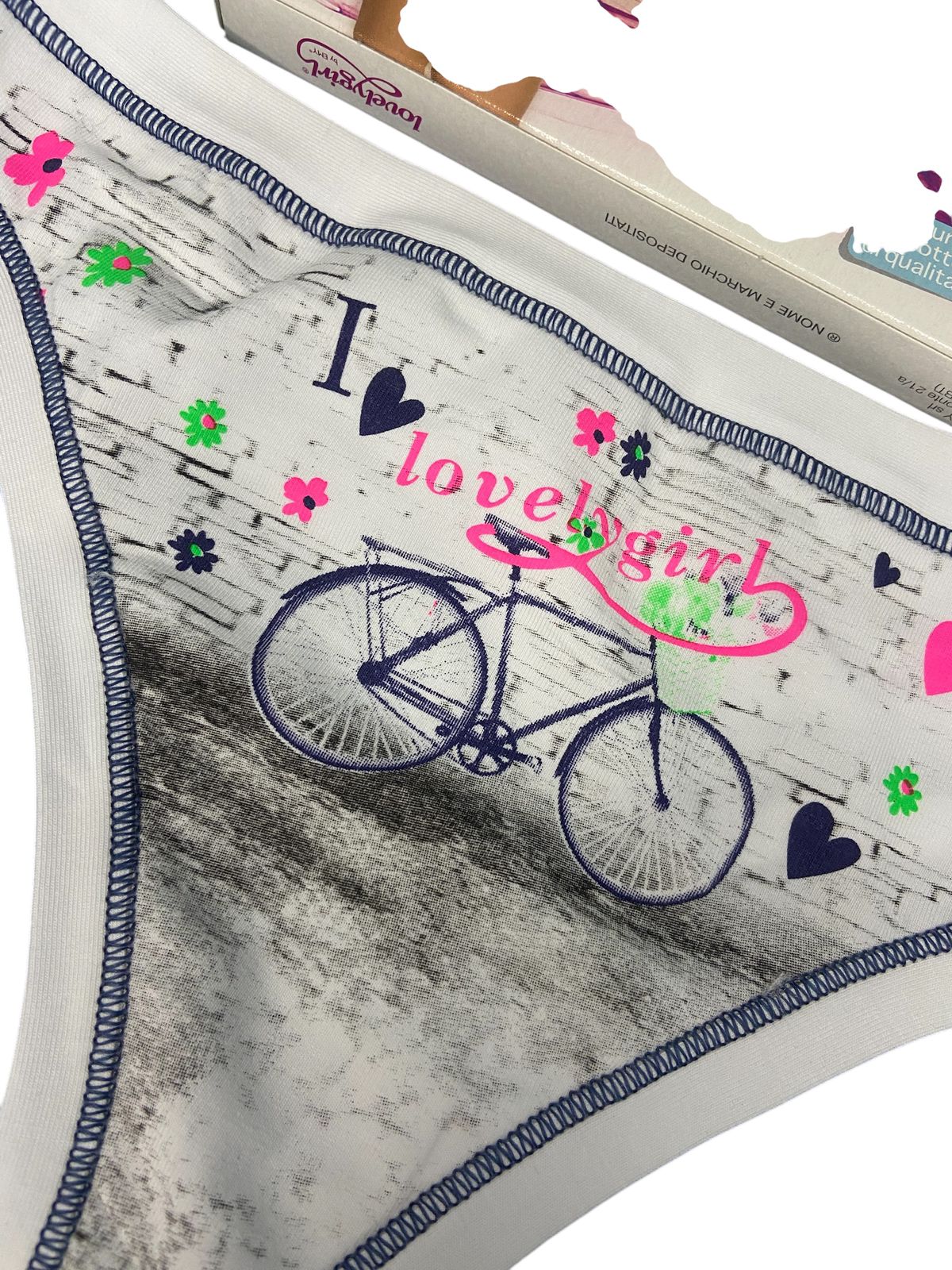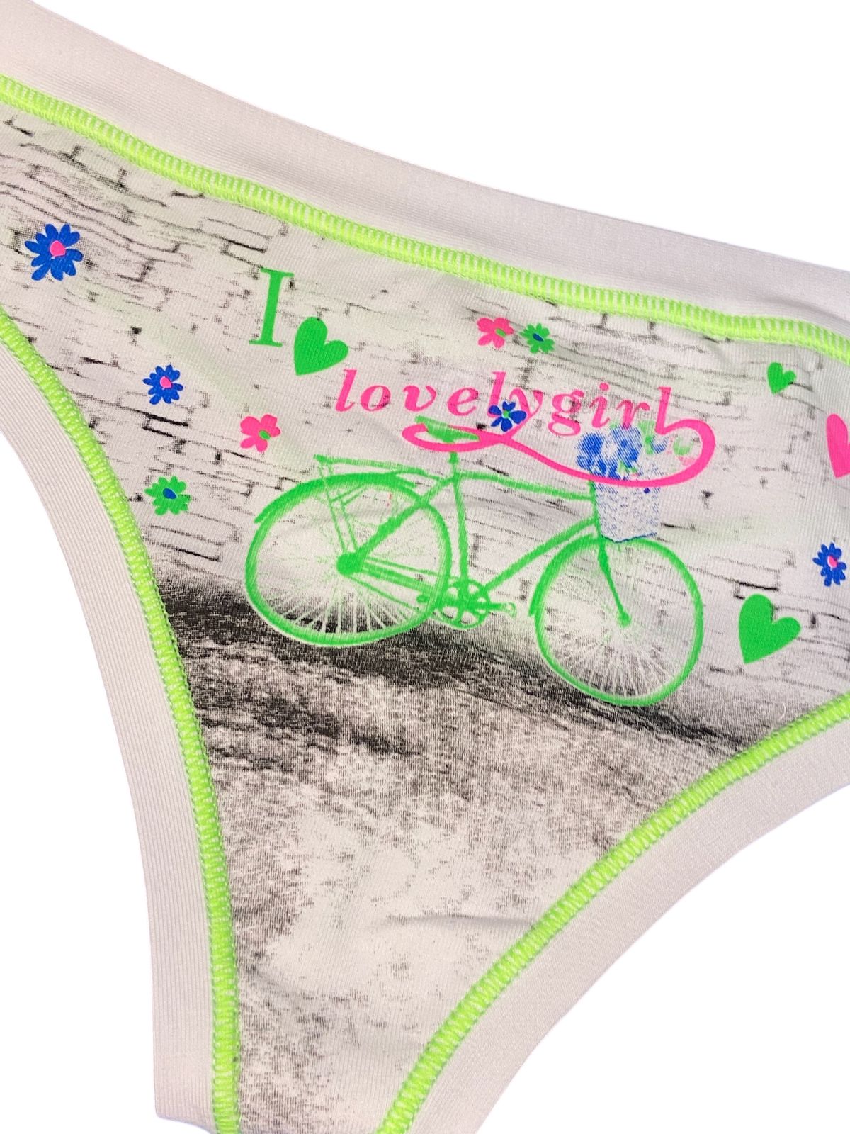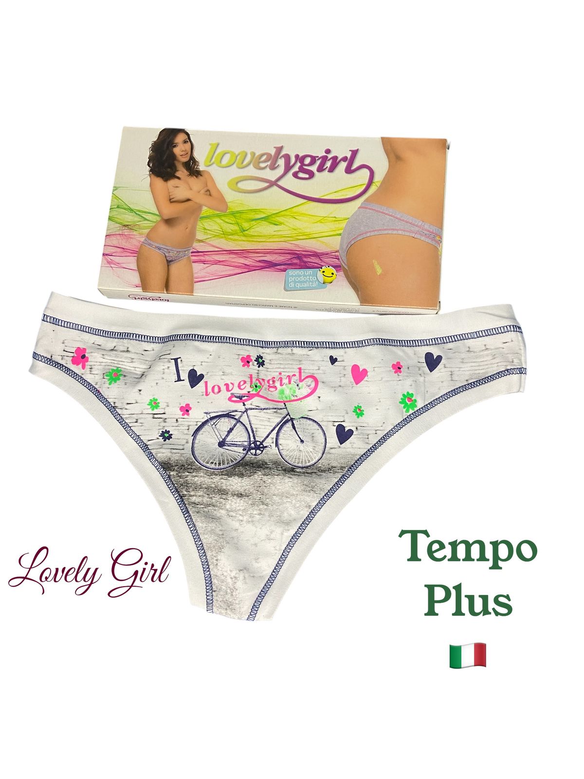 Женские классические трусы стринги отличного качества Итальянского бренда Lovelygirl by EMY. Подходят для повседневного гардероба любого формата. Плотная гладкая ткань из хлопка , отличны как спортивное белье, для активного частого ношения на любой сезон. Подходят для девушек подросткового возраста. ПРИНТ ВЕЛОСИПЕД-МОДНО И КРЕАТИВНО. Изделия полностью произведены в Италии на фабрике Confezioni Emy (см. фото этикетки) Используйте как спортивные на гимнастику, танцы, фитнес, йогу. Все изделия упакованы в стильную фирменную коробку, что станет весомым плюсом при выборе подарка. Важно: изделия, согласно действующему Российскому законодательству (СанПиН) отнесены к невозвратным, внимательно проверяйте размер (при выборе ориентируйтесь на Российский)