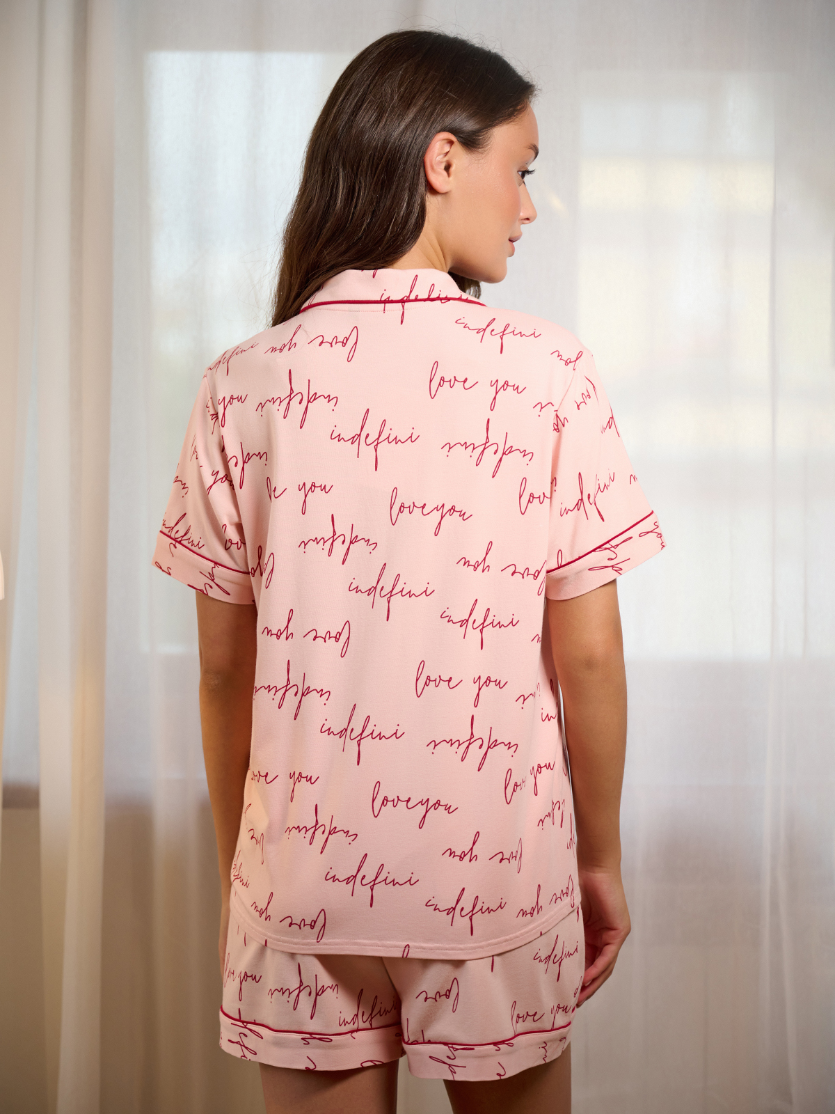 Рубашка выполнена в нежно-розовом цвете с романтичным принтом в виде надписей «love you» и «indefini».