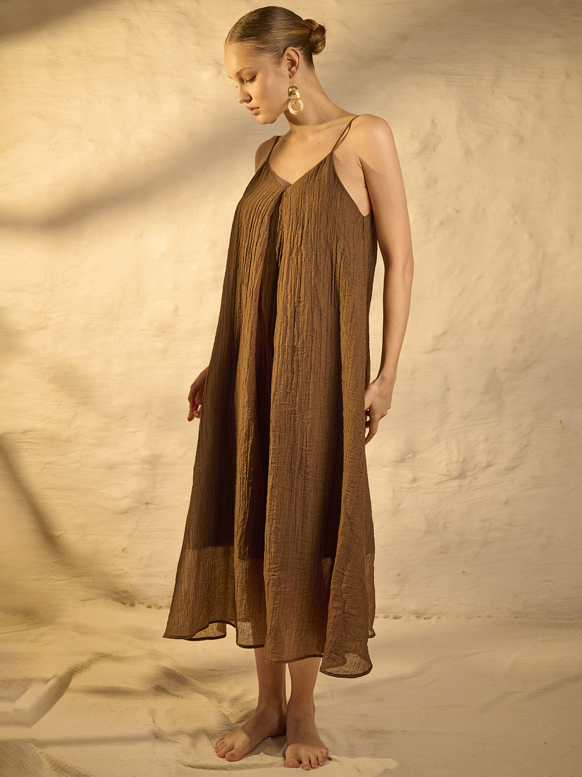 Свободное длинное платье-сарафан в глубоком шоколадном оттенке. Идеальный для летнего гардероба. Длина бретелей регулируется — легко подобрать комфортную посадку под свой тип фигуры. Внутри платья подклад из нежной, приятной к телу ткани.